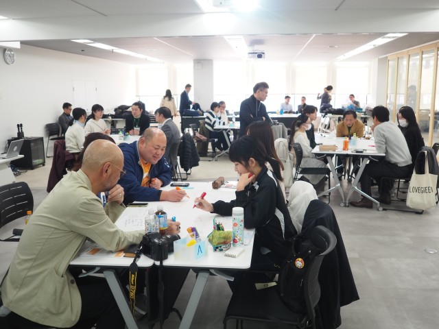 地元企業 株式会社いづよね、ジィ・アンド・ジィ株式会社、株式会社デジアラホールディングス、株式会社ネクストページ の4社と、大学生・専門学校生11名が参加。企業の採用プレゼンを聞いたり、キャリアデザインや働き方についてのワークショップを行いました。経営者と学生が直接意見交換することで、お互いの視野を広げることができました!